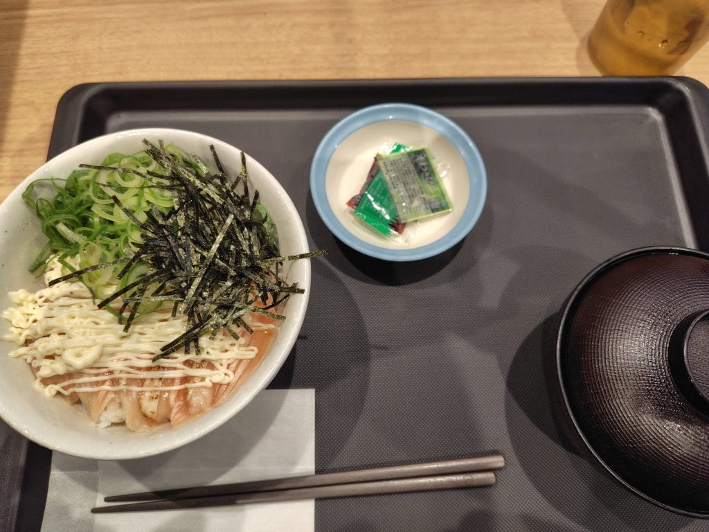 いつもは土日は朝昼兼用で松屋の朝食の大盛を頼むのですが、「炙りマヨサーモン丼」を頼んでしまいました。これも期間限定だし、食べておかないとね。