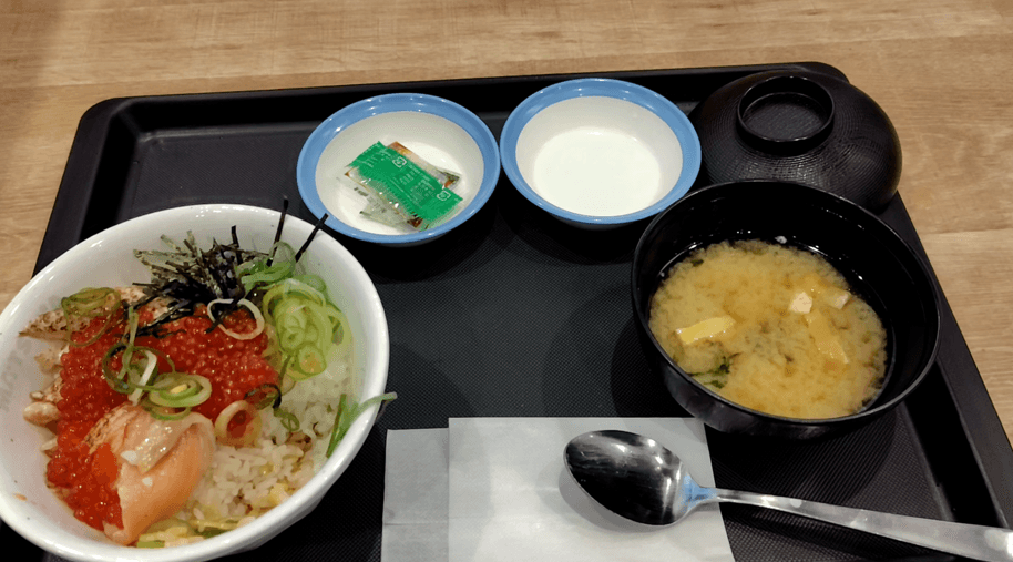 今回食べたのはただのいくら丼ではなく、炙りサーモンもご飯に乗っているものです。